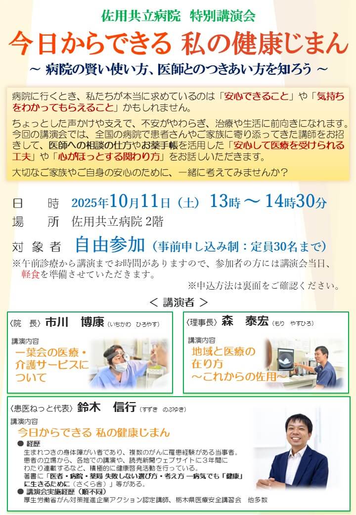 市川博康院長、森泰宏理事長と、外部からのゲストとして「患医ねっと」の鈴木信行氏をお招きして、それぞれの視点で講演を行ってもらいます。