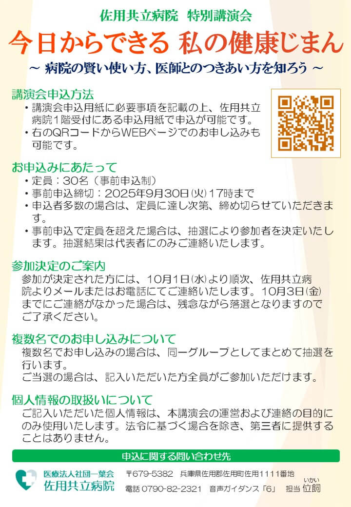10月11日(土)に佐用共立病院にて、特別講演会を開催します。
